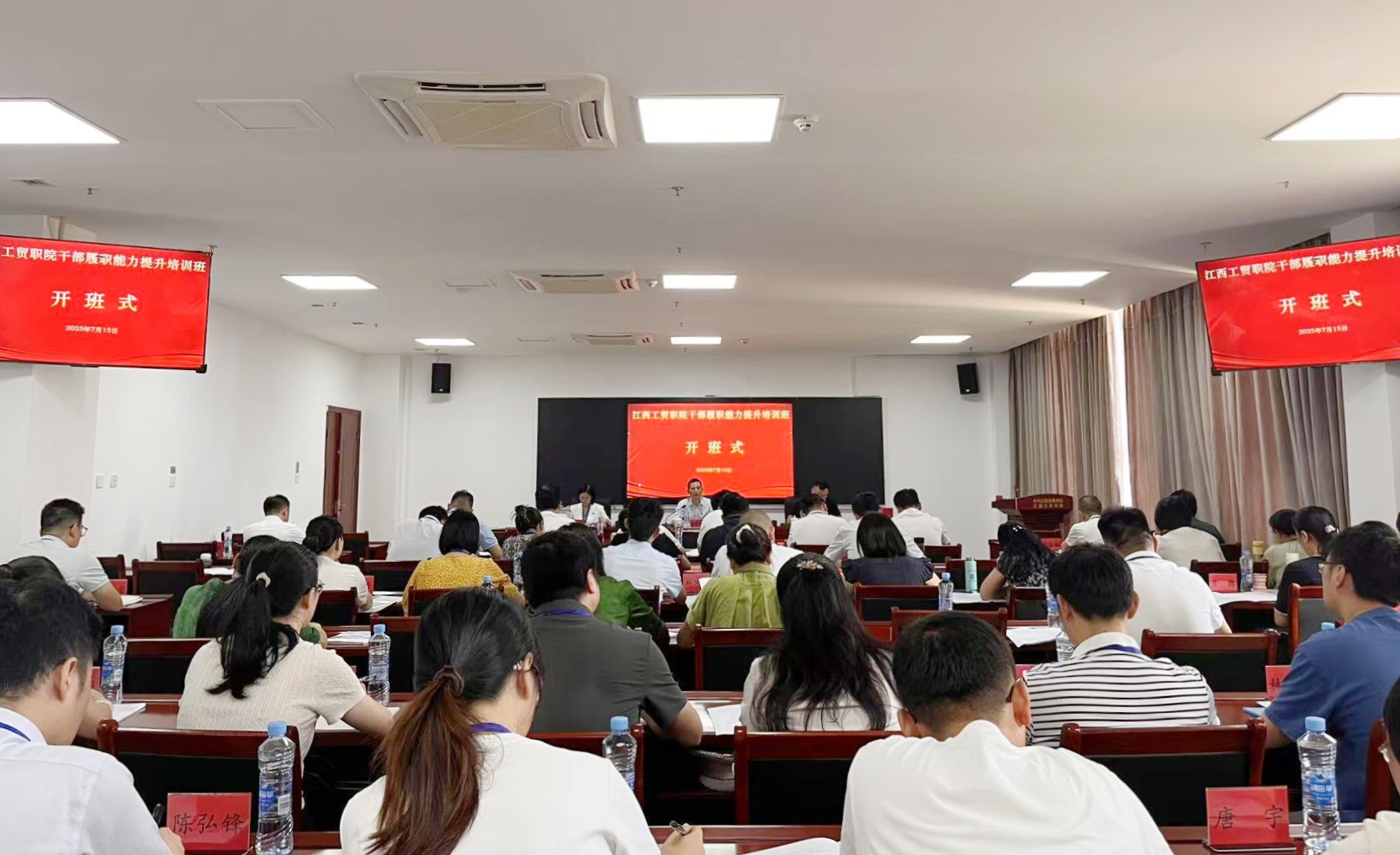 7月15日至17日,江西工业贸易职业技术学院在省委党校成功举办干部履职能力提升培训班。本次培训由学院党委精心组织,旨在深入贯彻落实新时代高等教育发展要求,紧扣学院“双高计划”建设大局,着力提升干部队伍的政治素养、管理能力和创新意识,为学院“双高”建设和高质量发展提供坚实的人才保障与组织支撑。学院全体中层以上干部、后备干部及骨干教师等共60余人参加培训。学院党委副书记吴新谱受学院党委书记、院长万晓波委托,出席开班式和结业典礼并讲话。